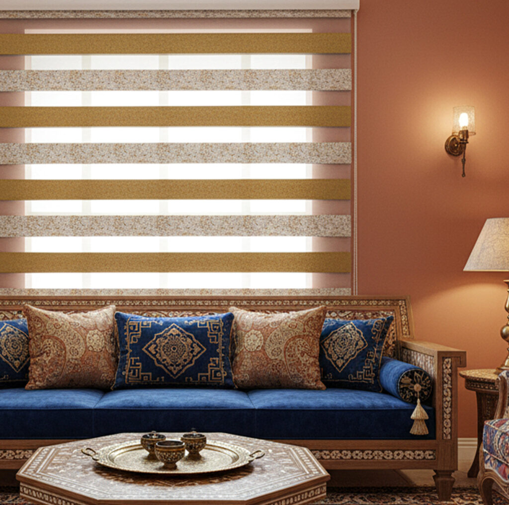 Son esthétique moderne et son tissu orné de motifs subtils apportent une touche de sophistication à tout intérieur, qu’il s’agisse d’un salon élégant ou d’un bureau contemporain. Le système d’ajustement simple et intuitif garantit une utilisation confortable, tandis que l’option motorisée offre un confort supplémentaire pour les espaces modernes.